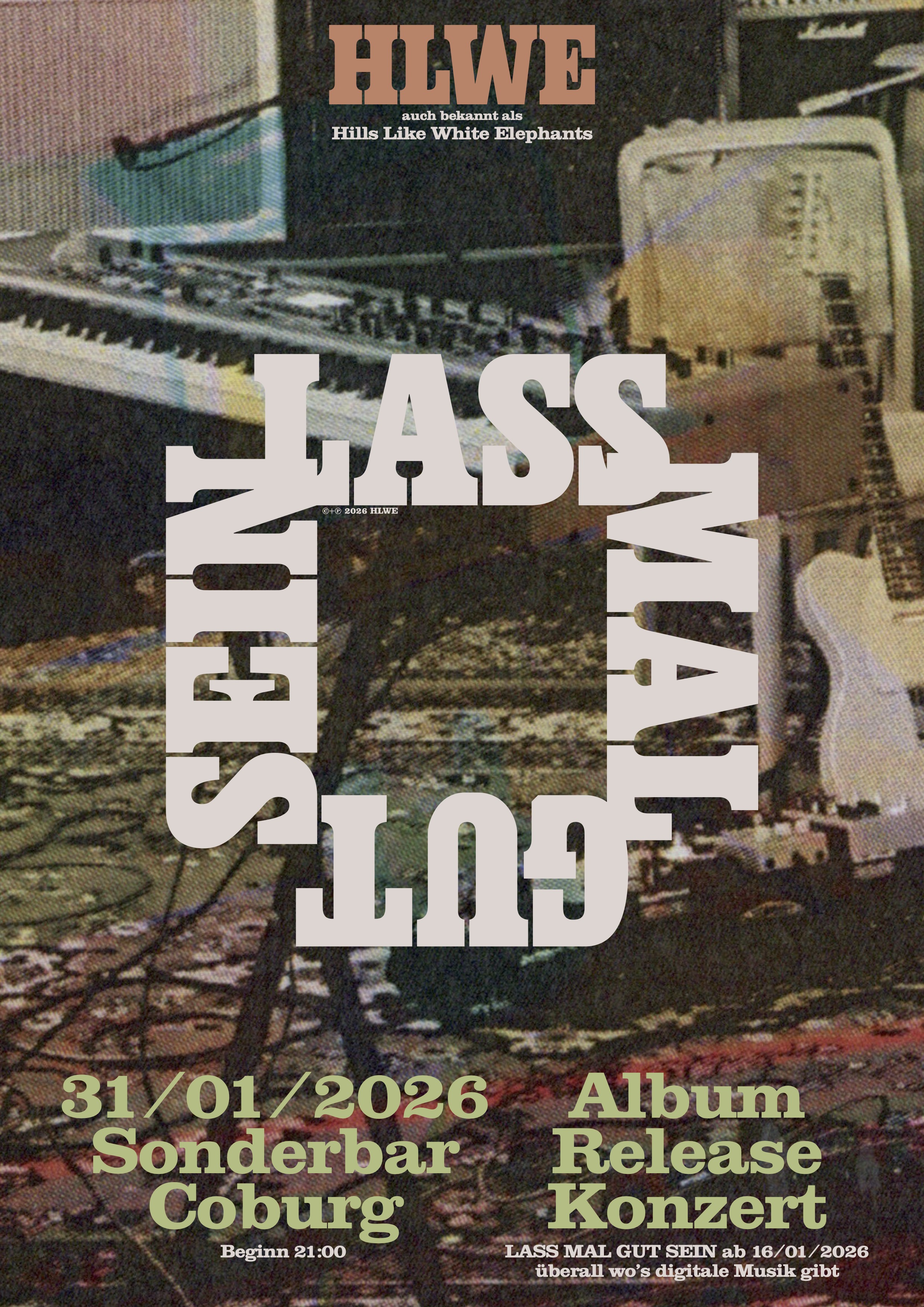 In einer alten Papierfabrik in Coburg feilen wir, Hills Like White Elephants – kurz HLWE – an unserem ganz eigenen Sound. Als siebenköpfige Band machen wir Rockmusik, die sich nicht um Genregrenzen schert, und produzieren vom ersten Riff bis zum finalen Mix alles in kompletter Eigenregie.